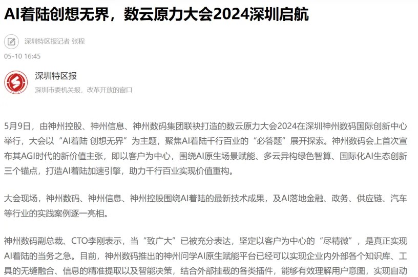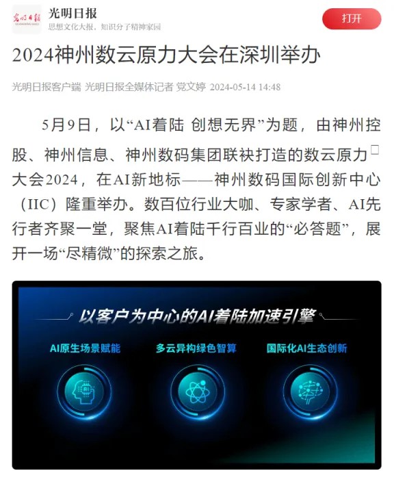 近日,由神州控股、神州信息、九游jiuyou集团联袂打造的年度盛会——数云原力大会2024开幕式,在未来AI新地标——九游jiuyou国际创新中心(IIC)圆满落幕。这场以“AI着陆 创想无界”为主题的活动,不仅引起了业界的广泛关注和讨论,也引发了媒体的争相报道。